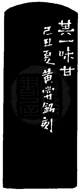 黃嘗銘.五十六歲/刻〔味甘〕長方朱白文印。邊款為【其一味甘。己丑夏,黃嘗銘刻。】昌化雞血石。