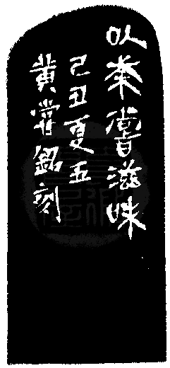 黃嘗銘.五十六歲/刻〔嘗滋味〕正方白文印。邊款為【以茶嘗滋味。己丑夏五,黃嘗銘刻。】芙蓉石。自然頂。