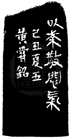 黃嘗銘.五十六歲/刻〔散悶氣〕正方朱文印。邊款為【以茶散悶氣。己丑夏五,黃嘗銘。】芙蓉石。自然頂。
