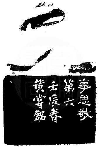 黃嘗銘.五十九歲/刻〔事思敬〕長方朱文印。邊款為【事思敬第六。壬辰春,黃嘗銘。】芙蓉石。獸鈕。