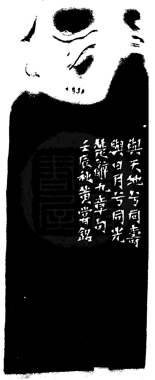 黃嘗銘.五十九歲/刻〔與天地兮同壽〕長方朱文印。邊款為【與天地兮同壽,與日月兮同光。楚辭九章句,壬辰秋,黃嘗銘。】壽山坑頭凍。彌勒佛鈕。