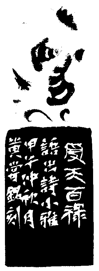 黃嘗銘.六十一歲/刻〔受天百祿〕正方白文印。邊款為【受天百祿。語出《詩.小雅》。甲午仲秋月,黃嘗銘刻。】芙蓉石。獸鈕。