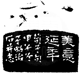 黃嘗銘.六十一歲/刻〔美意延年〕正方朱文印。邊款為【美意延年。荀子句。甲午冬,子昭治石并志。】