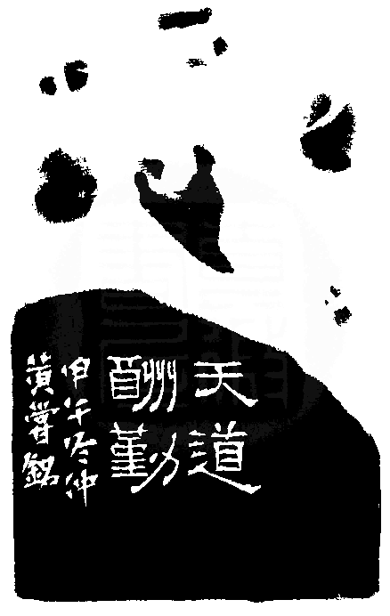 黃嘗銘.六十一歲/刻〔天道酬勤〕正方朱文印。邊款為【天道酬勤。甲午冬仲,黃嘗銘。】