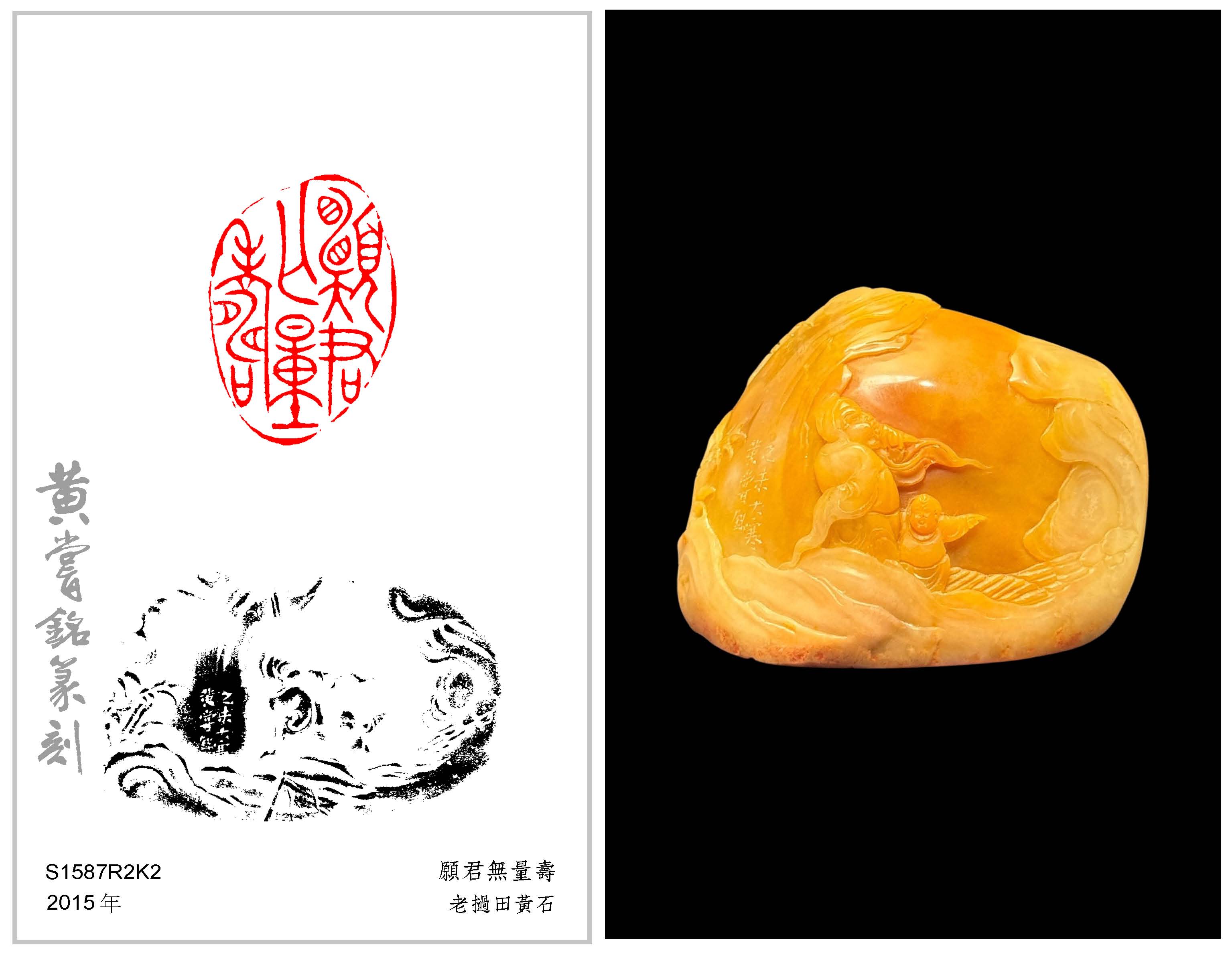黃嘗銘.六十二歲/刻〔願君無量壽〕自然形朱文印。邊款為【乙未大寒,黃嘗銘。】老撾田黃石。