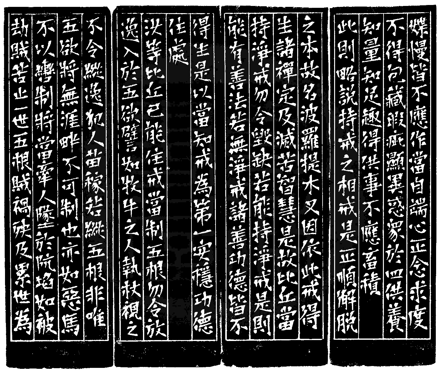 | | 印文:戒生禪定 | | 約 橫 2.8 X 豎 2.8 公分 印面圖 | | 黃嘗銘.六十二歲/刻〔戒生禪定〕正方加框白文印。邊款為【媟慢,皆不應作。當自端心,正念求度;不得包藏瑕疵,顯異惑眾;於四供養,知量知足,趣得供事,不應畜積。此則略說持戒之相。戒是正順解脫之本,故名波羅提木叉。因依此戒,得生諸禪定,及滅苦智慧。是故比丘,當持淨戒,勿令毀缺。若能持淨戒,是則能有善法;若無淨戒,諸善功德皆不得生。是以當知,戒為第一安隱功德住處。汝等比丘,已能住戒,當制五根,勿令放逸,入於五欲。譬如牧牛之人,執杖視之,不令縱逸,犯人苗稼。若縱五根,非唯五欲將無涯畔,不可制也;亦如惡馬,不以轡制,將當牽人墬於阬埳。如被劫賊,苦止一世;五根賊禍,殃及累世。為】巴林石。圓頂。 2015 年刻 |