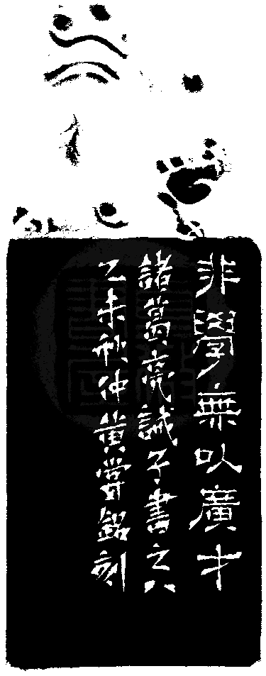 黃嘗銘.六十二歲/刻〔非學無以廣才〕正方朱文界格印。邊款為【非學無以廣才。諸葛亮誡子書之八,乙未秋仲,黃嘗銘刻。】老撾石。