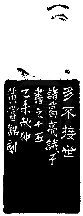 黃嘗銘.六十二歲/刻〔多不接世〕正方朱文印。邊款為【多不接世。諸葛亮誡子書之十五,乙未秋仲,黃嘗銘刻。】老撾石。