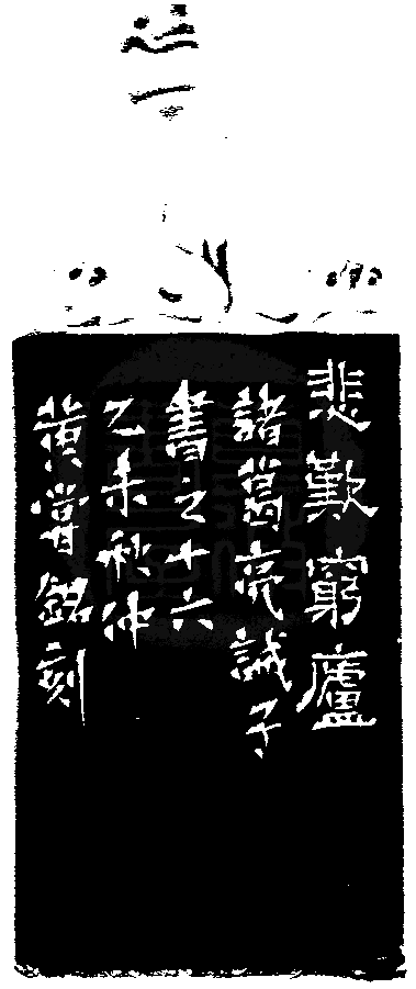 黃嘗銘.六十二歲/刻〔悲歎窮廬〕正方細朱文印。邊款為【悲歎窮廬。諸葛亮誡子書之十六,乙未秋仲,黃嘗銘刻。】老撾石。