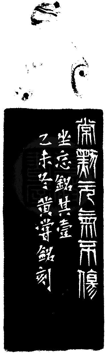 黃嘗銘.六十二歲/刻〔常默元氣不傷〕正方朱文印。邊款為【常默元氣不傷。坐忘銘其壹,乙未冬,黃嘗銘刻。】老撾石。獸鈕。