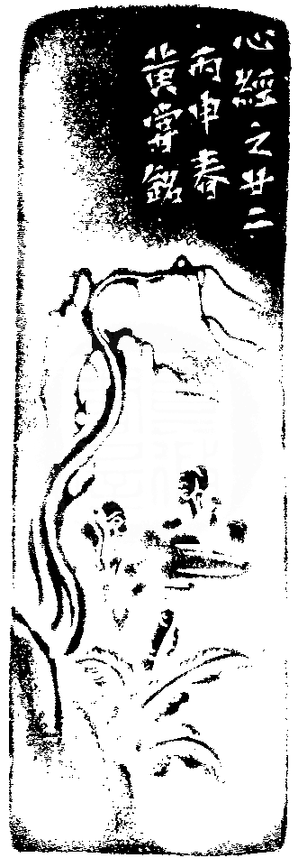 黃嘗銘.六十三歲/刻〔乃至無意識界〕正方白文縱格印。邊款為【心經之廿二。丙申春,黃嘗銘。】昌化黃凍石。山水薄意。