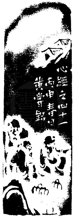 黃嘗銘.六十三歲/刻〔是大神咒〕長方白文縱格印。邊款為【心經之四十一。丙申春日,黃嘗銘。】昌化黃凍石。山水薄意。
