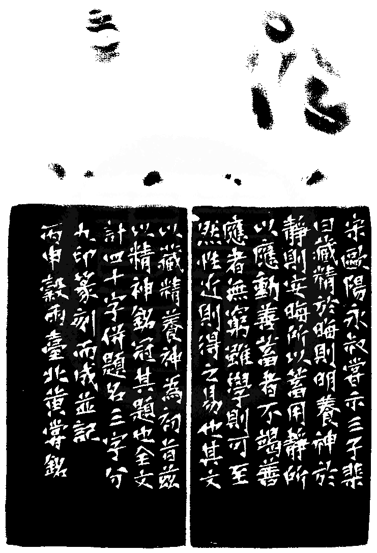黃嘗銘.六十三歲/刻〔精神銘〕正方加框白文印。邊款為【宋歐陽永叔嘗示三子棐曰:藏精於晦則明,養神於靜則安,晦所以蓄用,靜所以應動;善蓄者不竭,善應者無窮;雖學則可至,然性近則得之易也。其文以藏精養神為初旨,茲以精神銘冠其題也。全文計四十字,併題名三字,分九印篆刻而成並記。丙申穀雨,臺北黃嘗銘。】老撾石。獸鈕。