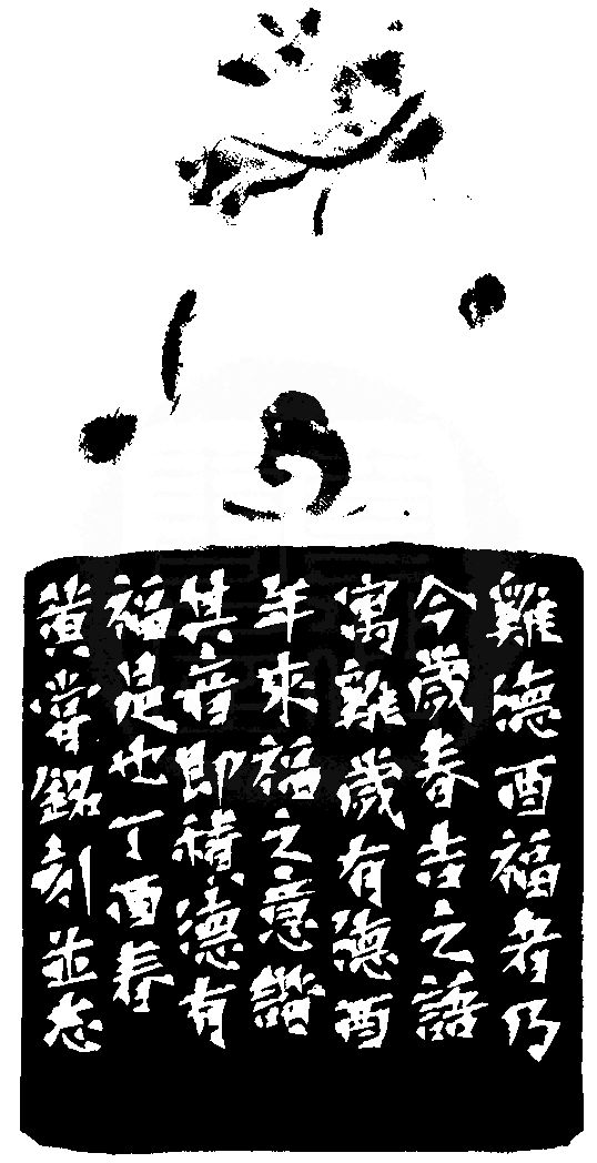 黃嘗銘.六十四歲/為林櫻蘭刻〔積德有福〕正方朱文印。邊款為【雞德酉福者,為今歲春吉之語,寓雞歲有德,酉年來福之意,諧其音即積德有福是也。丁酉春,黃嘗銘刻並志。】老撾石。獸鈕。