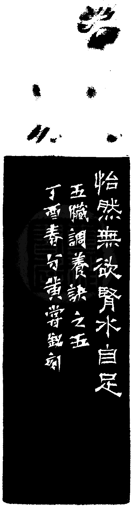 黃嘗銘.六十四歲/刻〔怡然無欲腎水自足〕正方朱文印。邊款為【怡然無欲腎水自足。五臟調養訣之五。丁酉春分,黃嘗銘刻。】老撾石。獸鈕。