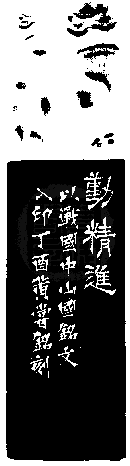 黃嘗銘.六十四歲/刻〔勤精進〕正方朱文印。邊款為【勤精進。以戰國中山國銘文入印。丁酉,黃嘗銘刻。】