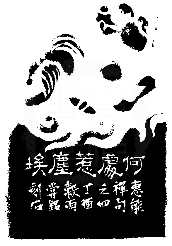 黃嘗銘.六十四歲/刻〔何處惹塵埃〕長橢圓朱文印。邊款為【何處惹塵埃。惠能禪句之四。丁酉穀雨,嘗銘刻石。】芙蓉石。