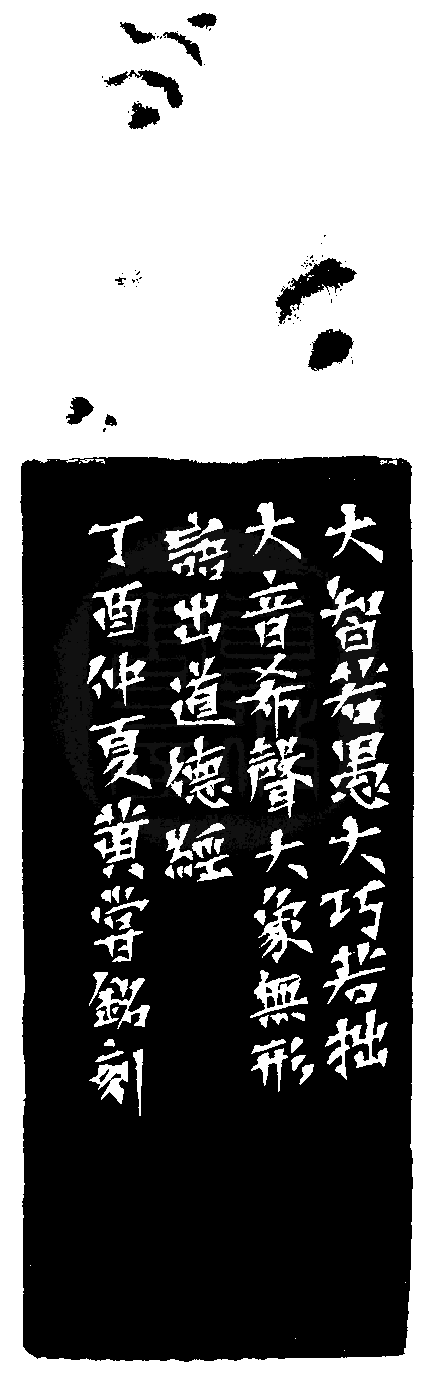 黃嘗銘.六十四歲/刻〔大智若愚〕正方朱文印。邊款為【大智若愚,大巧若拙,大音希聲,大象無形。語出道德經。丁酉仲夏,黃嘗銘刻。】老撾石。獸鈕。