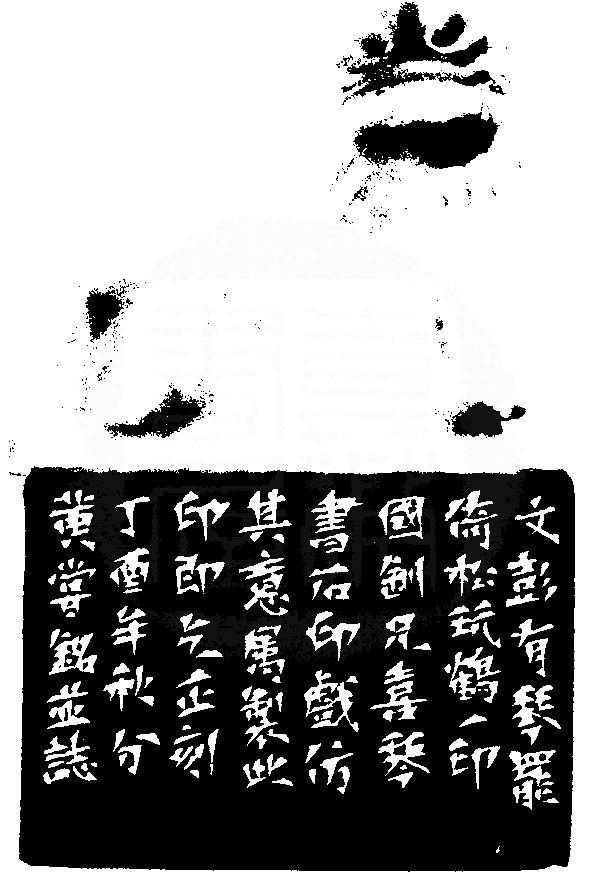 黃嘗銘.六十四歲/為簡國釧刻〔琴罷倚書翫石〕正方白文印。邊款為【文彭有琴罷倚松玩鶴,國釧兄喜琴書石印,戲仿其意屬製此印,即乞正刻。丁酉年秋分,黃嘗銘並誌。】老撾石。獸鈕。