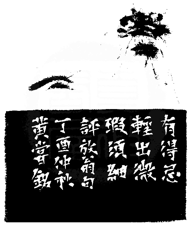 黃嘗銘.六十四歲/刻〔有得忌輕出微瑕須細評〕正方朱文印。邊款為【有得忌輕出,微瑕須細評。放翁句。丁酉仲秋,黃嘗銘。】老撾石。獸鈕。