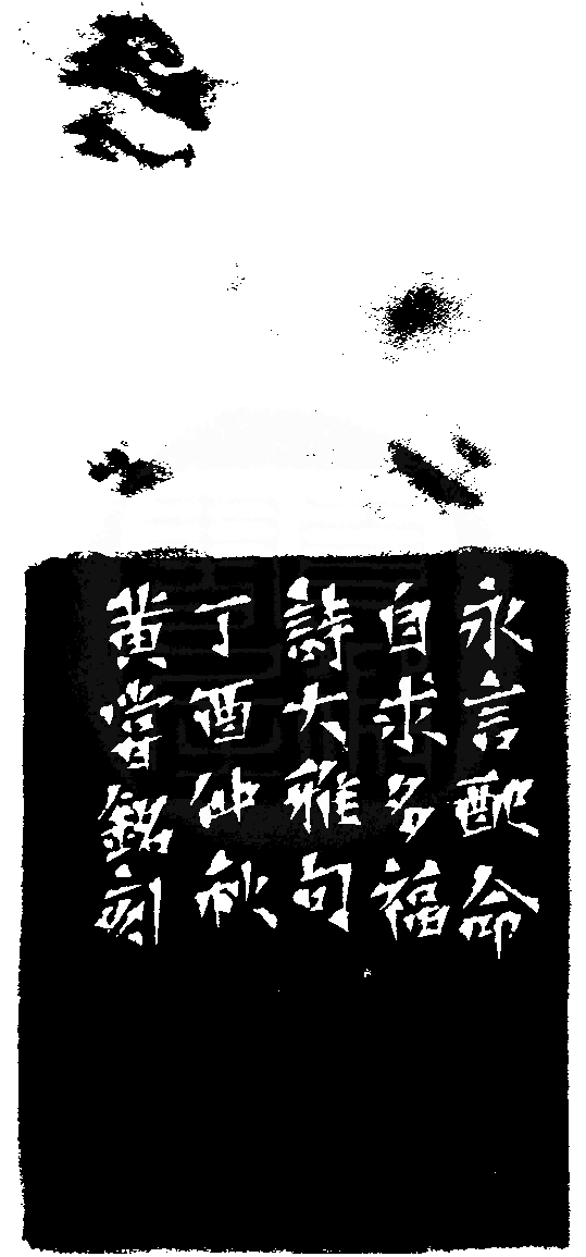 黃嘗銘.六十四歲/刻〔永言配命自求多福〕長方朱文印。邊款為【永言配命,自求多福。詩大雅句。丁酉仲秋,黃嘗銘刻。】老撾石。獸鈕。