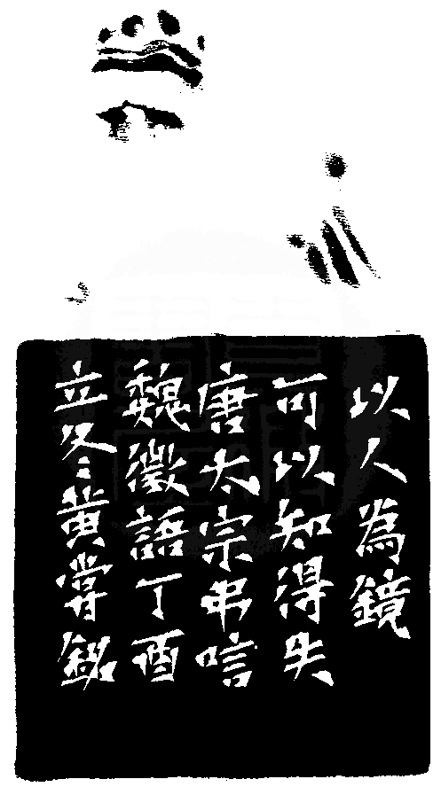 黃嘗銘.六十四歲/刻〔鏡人知得失〕正方朱文印。邊款為【以人為鏡可以知得失。唐太宗弔唁魏徵語。丁酉立冬,黃嘗銘。】老撾石。獸鈕。