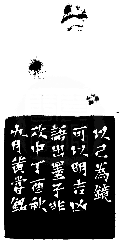 黃嘗銘.六十四歲/刻〔鏡己明吉凶〕正方白文印。邊款為【以己為鏡可以明吉凶。語出墨子非攻中。丁酉秋九月,黃嘗銘。】老撾石。獸鈕。