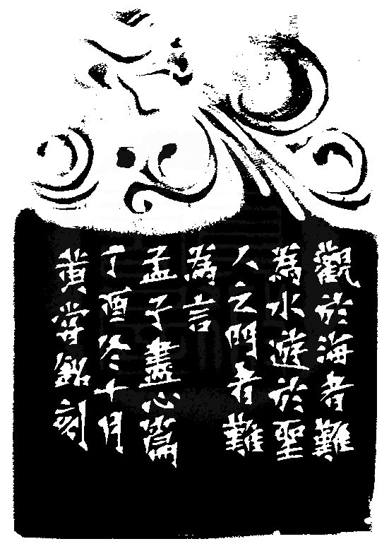 黃嘗銘.六十四歲/刻〔觀海者難為水〕長方朱文印。邊款為【觀於海者難為水,遊於聖人之門者難為言。《孟子.盡心篇》。丁酉冬十月,黃嘗銘刻。】老撾石。獸鈕。