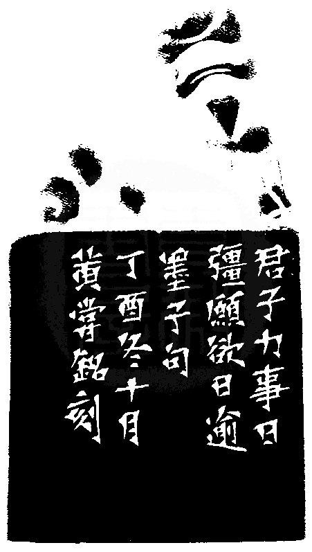 黃嘗銘.六十四歲/刻〔君子力事日強〕長方朱文印。邊款為【君子力事日強,願欲日逾。墨子句。丁酉冬十月,黃嘗銘刻。】老撾石。獸鈕。