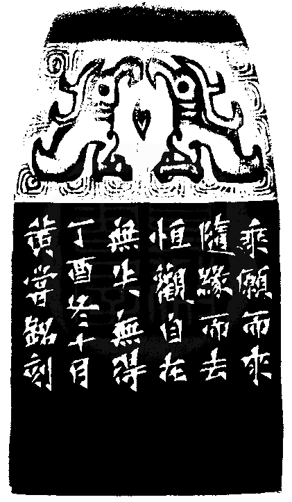 黃嘗銘.六十四歲/刻〔且隨緣〕正方朱文印。邊款為【乘願而來,隨緣而去,恆觀自在,無失無得。丁酉冬十月,黃嘗銘刻。】芙蓉石。覆斗鈕。