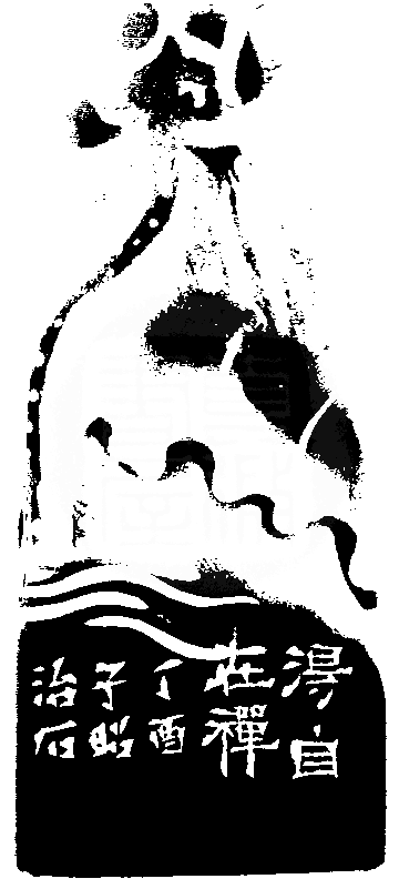 黃嘗銘.六十四歲/刻〔得自在禪〕正方朱文印。邊款為【得自在禪。丁酉,子昭治石。】芙蓉石。荷葉浮雕鈕。