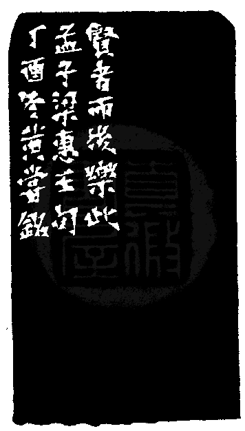 黃嘗銘.六十四歲/刻〔賢者而後樂此〕長方白文印。邊款為【賢者而後樂此。孟子梁惠王句。丁酉冬,黃嘗銘。】巴林雞血石。平頂。