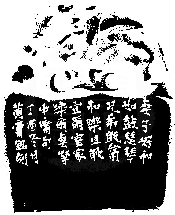 黃嘗銘.六十四歲/刻〔和樂且耽〕長橢圓朱文印。邊款為【妻子好和,如鼓瑟琴。兄弟既翕,和樂且耽。宜爾室家,樂爾妻孥。中庸句。丁酉冬月,黃嘗銘刻。】壽山杜陵石。鏊龍鈕。