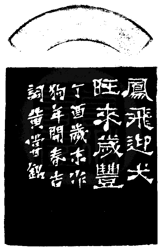 黃嘗銘.六十四歲/刻〔金犬旺歲〕正方白文界格印。邊款為【鳳飛迎犬,旺來歲豐。丁酉歲末,作狗年開春吉詞,黃嘗銘。】老撾石。瓦型鈕。