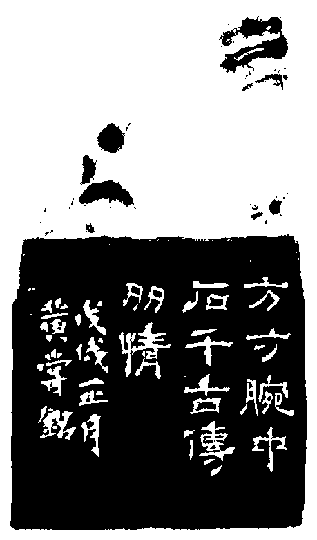 黃嘗銘.六十五歲/刻〔腕中有情〕長方加框白文印。邊款為【方寸腕中石,千古傳多情。戊戌正月,黃嘗銘。】老撾石。獸鈕。
