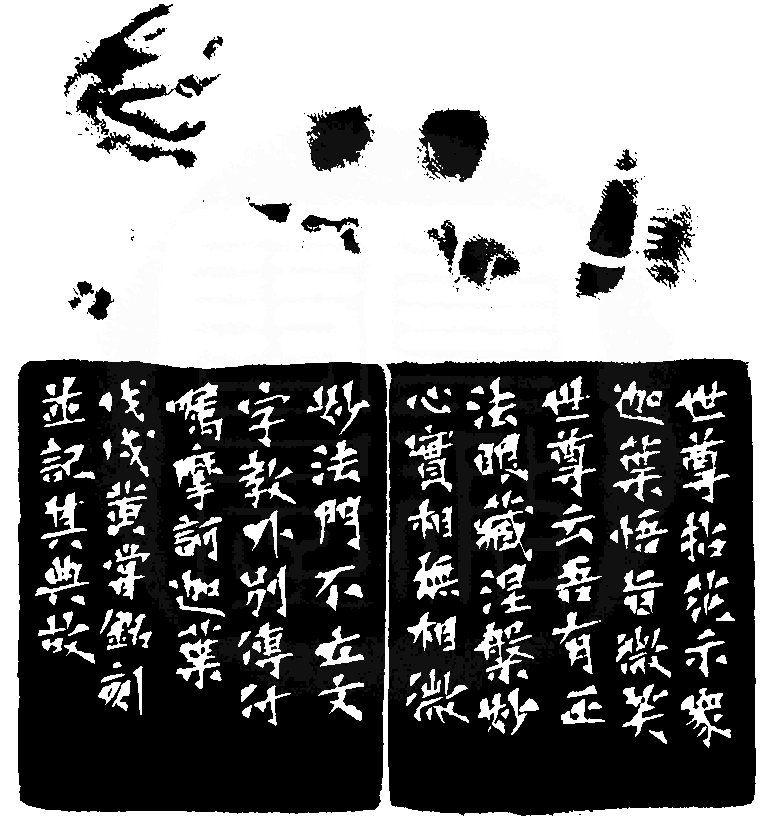 黃嘗銘.六十五歲/刻〔拈花微笑〕正方朱文印。邊款為【世尊拈花示眾,迦葉悟旨微笑。世尊云:吾有正法眼藏,涅槃妙心,實相無相,微妙法門,不立文字,教外別傳,付囑摩訶迦葉。戊戌,黃嘗銘刻並記其典故。】老撾石。獸鈕。