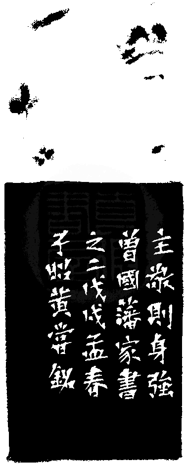 黃嘗銘.六十五歲/刻〔主敬則身強〕正方朱文印。邊款為【主敬則身強。曾國藩家書之二。戊戌孟春,子昭黃嘗銘。】老撾石。獸鈕。