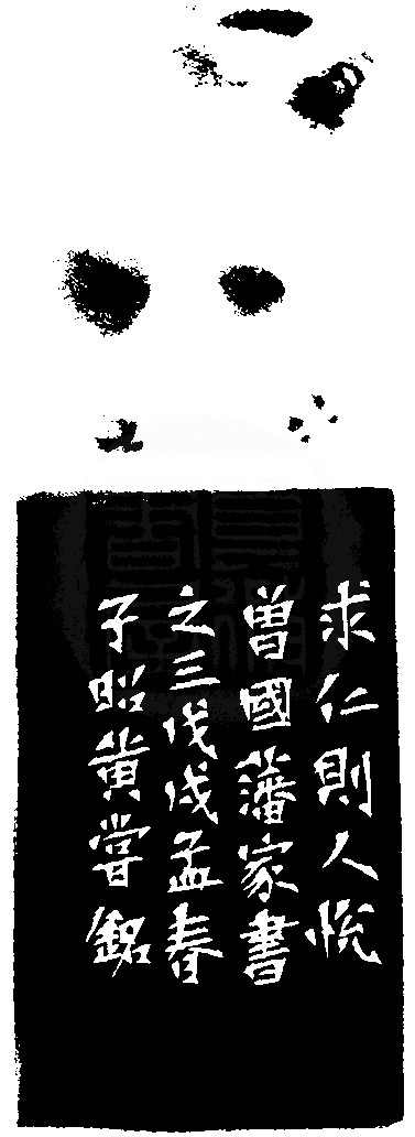 黃嘗銘.六十五歲/刻〔求仁則人悅〕正方朱文印。邊款為【求仁則人悅。曾國藩家書之三。戊戌孟春,子昭黃嘗銘。】老撾石。獸鈕。