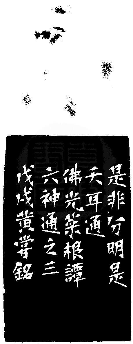 黃嘗銘.六十五歲/刻〔是非分明天耳通〕正方朱文印。邊款為【是非分明天耳通。佛光菜根譚六神通之三。戊戌,黃嘗銘。】老撾石。龍鈕。