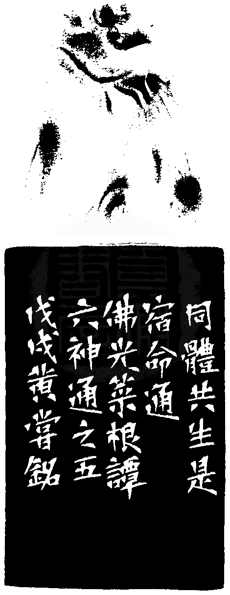 黃嘗銘.六十五歲/刻〔同體共生宿命通〕正方朱文印。邊款為【同體共生宿命通。佛光菜根譚六神通之五。戊戌,黃嘗銘。】老撾石。龍鈕。