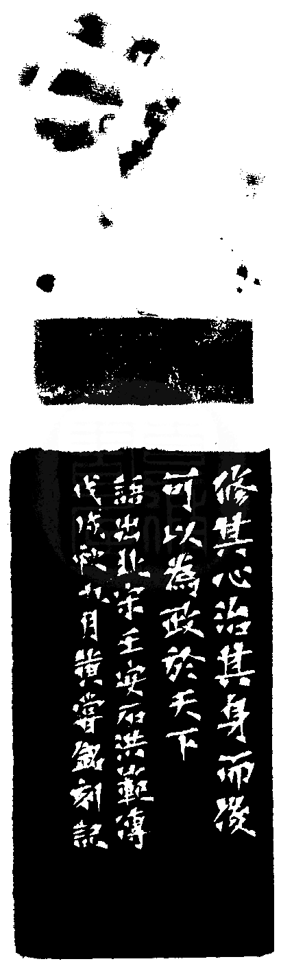 黃嘗銘.六十五歲/刻〔修其心治其身〕正方朱文印。邊款為【修其心,治其身,而後可以為政於天下。語出北宋王安石洪範傳。戊戌秋九月,黃嘗銘刻記。】巴林石。獸鈕。