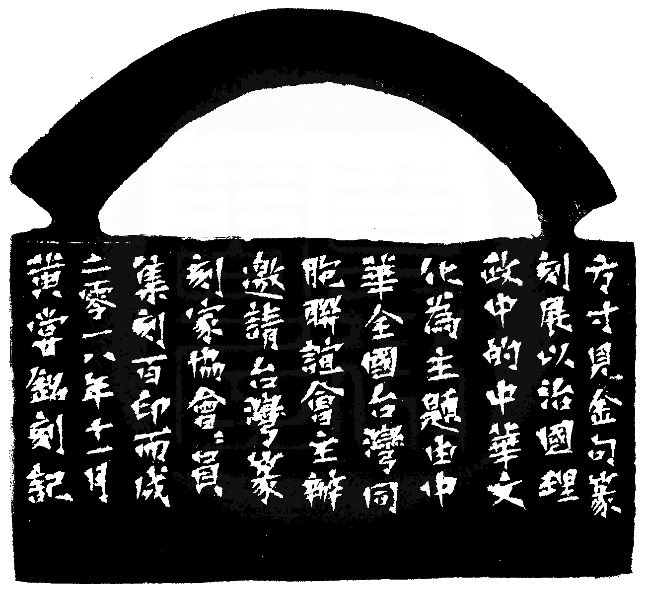 黃嘗銘.六十五歲/刻〔方寸見金句〕正方滿白文印。邊款為【方寸見金句篆刻展,以治國理政中的中華文化為主題,由中華全國台灣同胞聯誼會邀請台灣篆刻家協會會員集刻百印而成。二零一八年十一月,黃嘗銘篆刻并記。】青海石。瓦鈕。