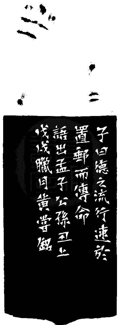 黃嘗銘.六十五歲/刻〔置郵傳命〕圓形朱文印。邊款為【子曰;德之流行,速於置郵而傳命。語出孟子公孫丑上。戊戌臘月,黃嘗銘。】老撾石。獸鈕。