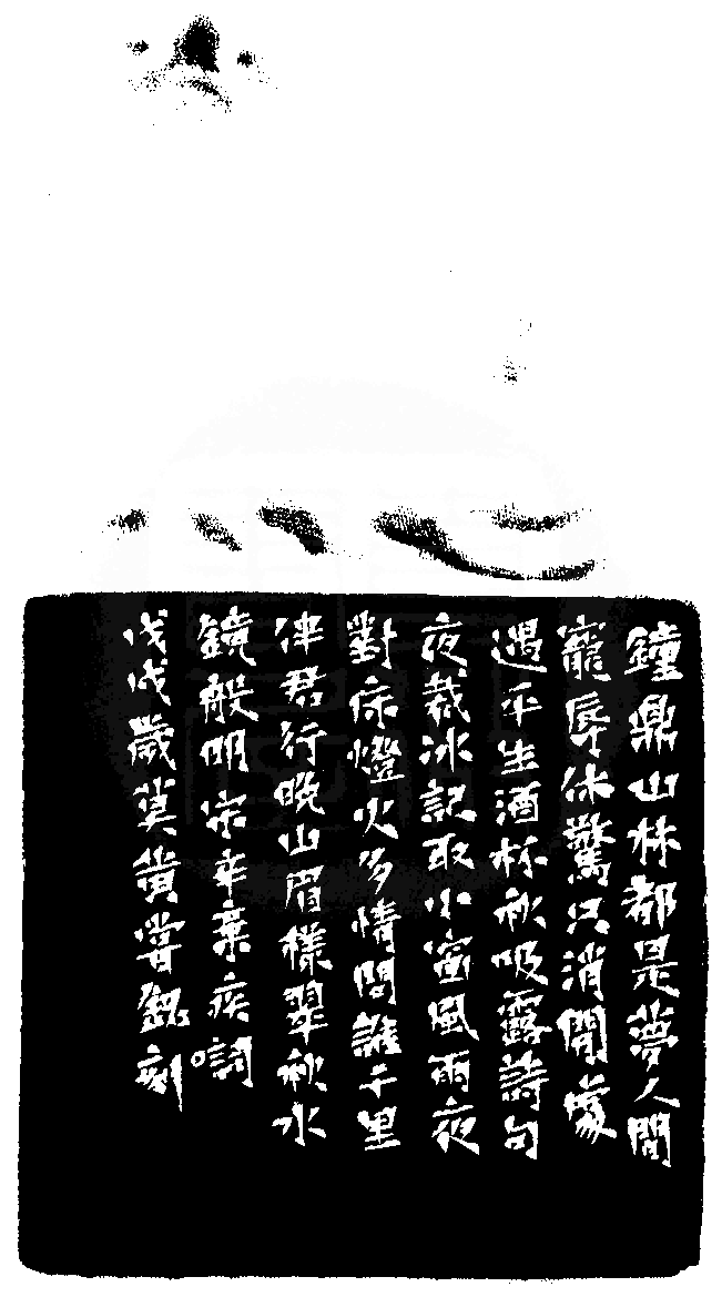黃嘗銘.六十五歲/刻〔鐘鼎山林都是夢〕正方朱文印。邊款為【鐘鼎山林都是夢,人間寵辱休驚,只消閒處遇平生,酒杯秋吸露,詩句夜裁冰。記取小窗風雨夜,對床燈火多情,問誰千裡伴君行,晚山眉樣翠,秋水鏡般明。宋辛棄疾詞。戊戌歲莫,黃嘗銘刻。】老撾石。獨角獸鈕。