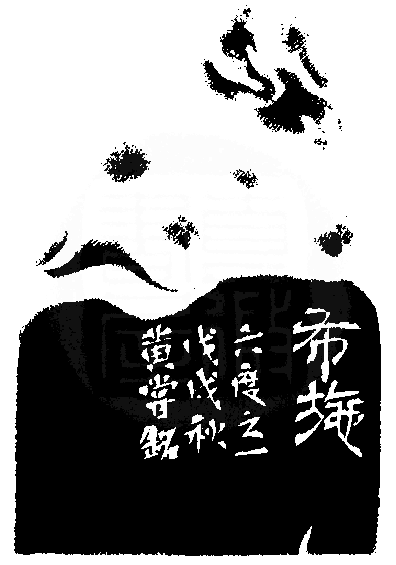 黃嘗銘.六十五歲/刻〔布施〕長方朱文印。邊款為【布施。六度之一。戊戌秋,黃嘗銘。】老撾田黃石。獸鈕。