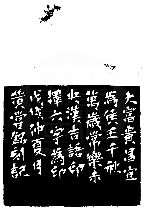 黃嘗銘.六十五歲/刻〔大富貴樂未央〕正方朱文印。邊款為【大富貴昌,宜為侯王,千秋萬歲,長樂未央。漢吉語印,擇六字為印。戊戌仲夏月,黃嘗銘刻記。】老撾石。獸鈕。