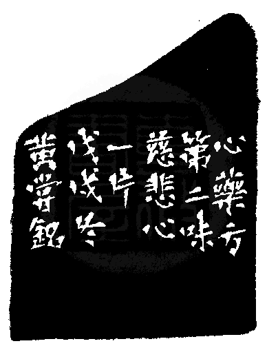 黃嘗銘.六十五歲/刻〔慈悲心一片〕正方加框白文印。邊款為【《心藥方》第二味,慈悲心一片。戊戌冬,黃嘗銘。】老撾石。自然頂。