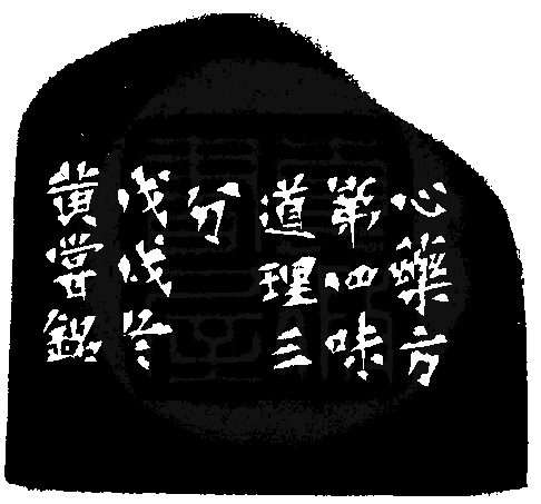 黃嘗銘.六十五歲/刻〔道理三分〕長方白文印。邊款為【《心藥方》第四味,道理三分。戊戌冬,黃嘗銘。】老撾石。自然頂。
