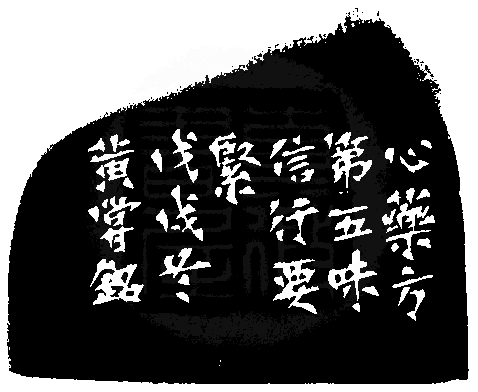 黃嘗銘.六十五歲/刻〔信行要緊〕長方朱文印。邊款為【《心藥方》第五味,信行要緊。戊戌冬,黃嘗銘。】老撾石。自然頂。