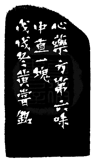 黃嘗銘.六十五歲/刻〔中直一塊〕正方白文印。邊款為【《心藥方》第六味,中直一塊。戊戌冬,黃嘗銘。】老撾石。自然頂。